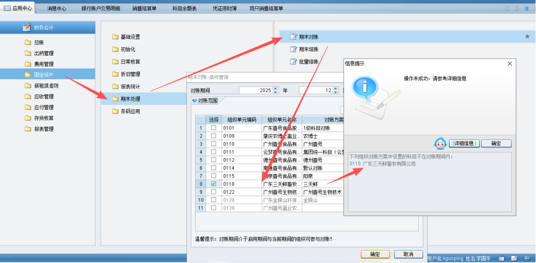 因此在进行以前期间的对账时,会提示:科目不在查询期间内。