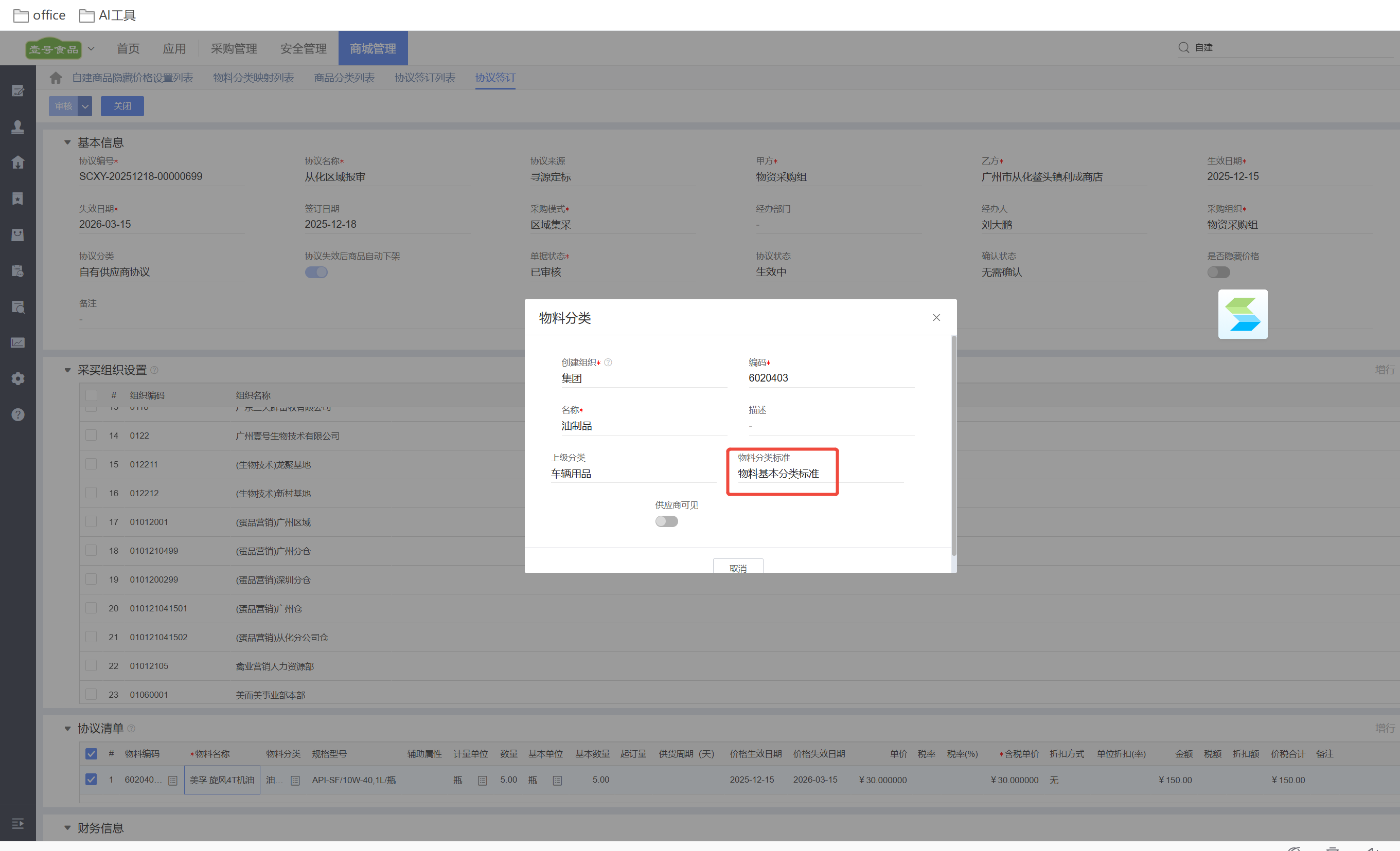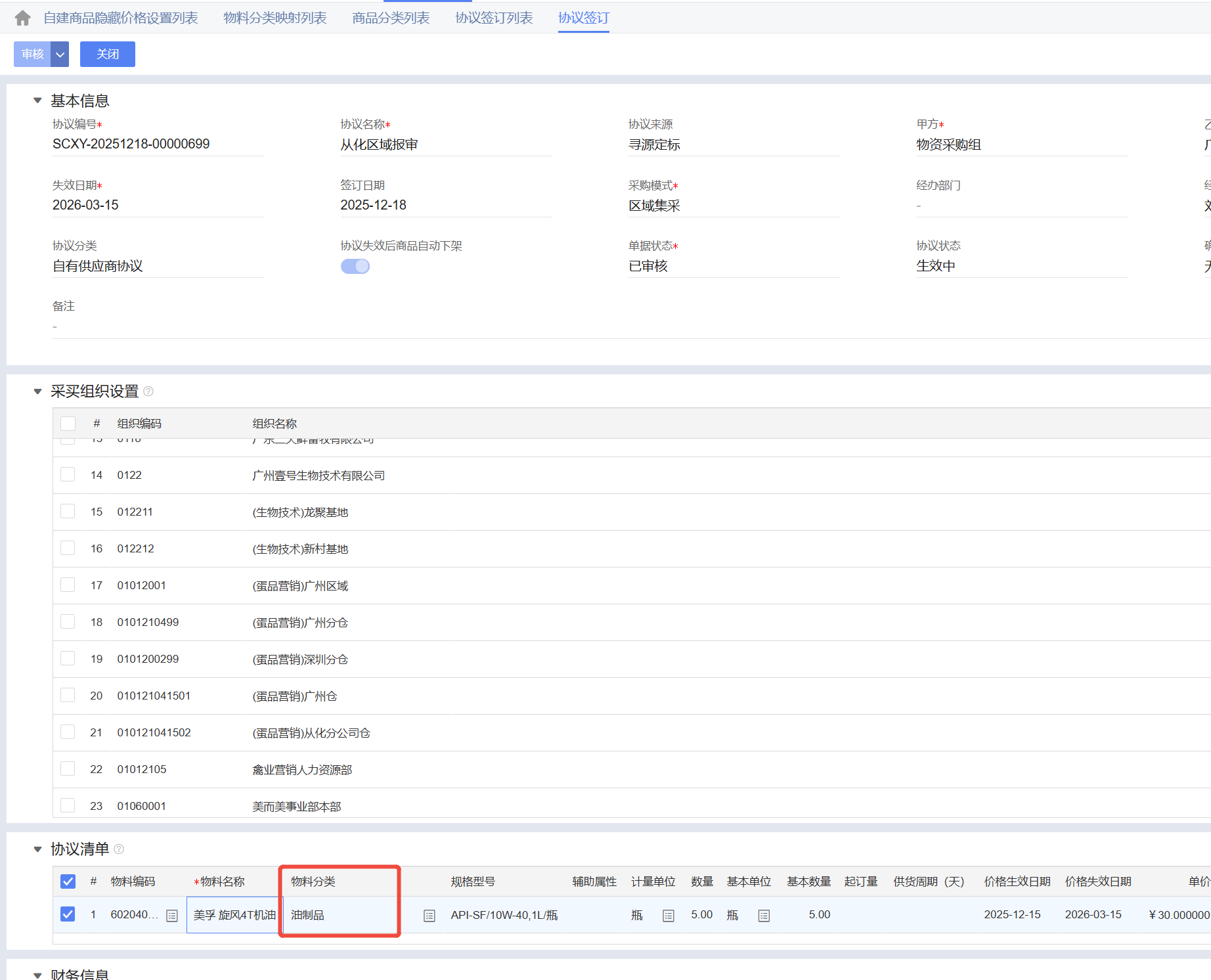 2、检查协议签订物料分类,以及对应的分类标准是否正确