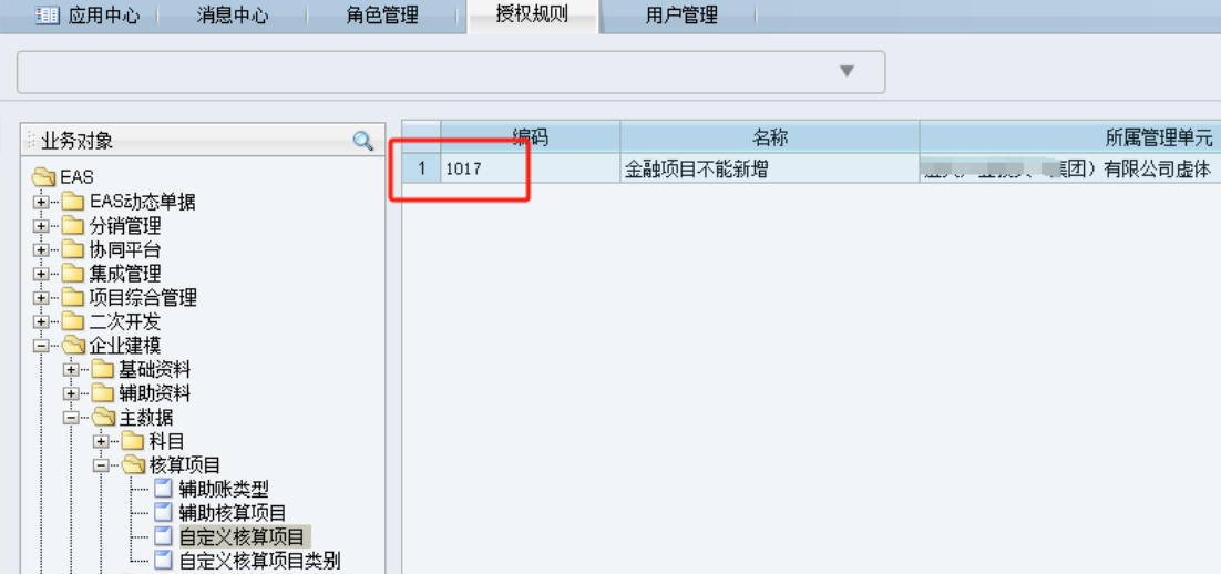 如下图,自定义核算项目:03-金融项目,只能由集团内部指定的一个用户新增