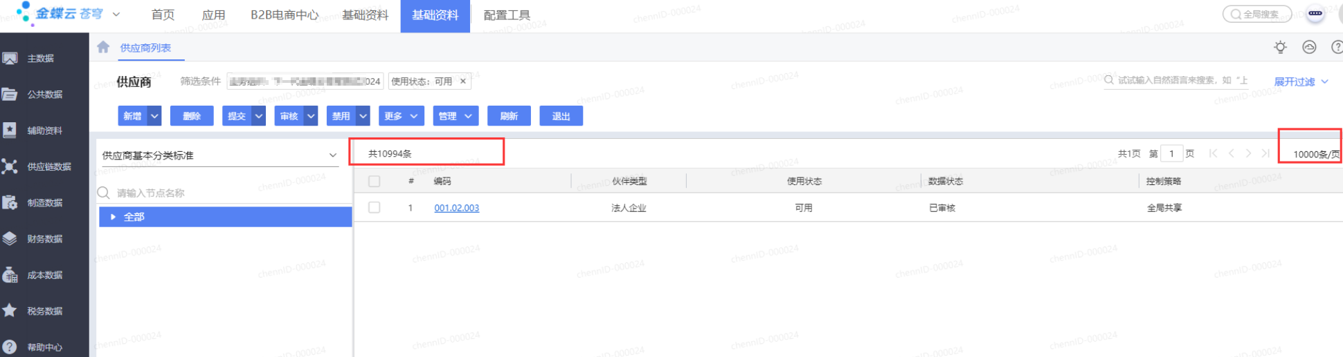 问题:供应商列表数据共10994条,设置每页展示10000条,但是只能看到一条。