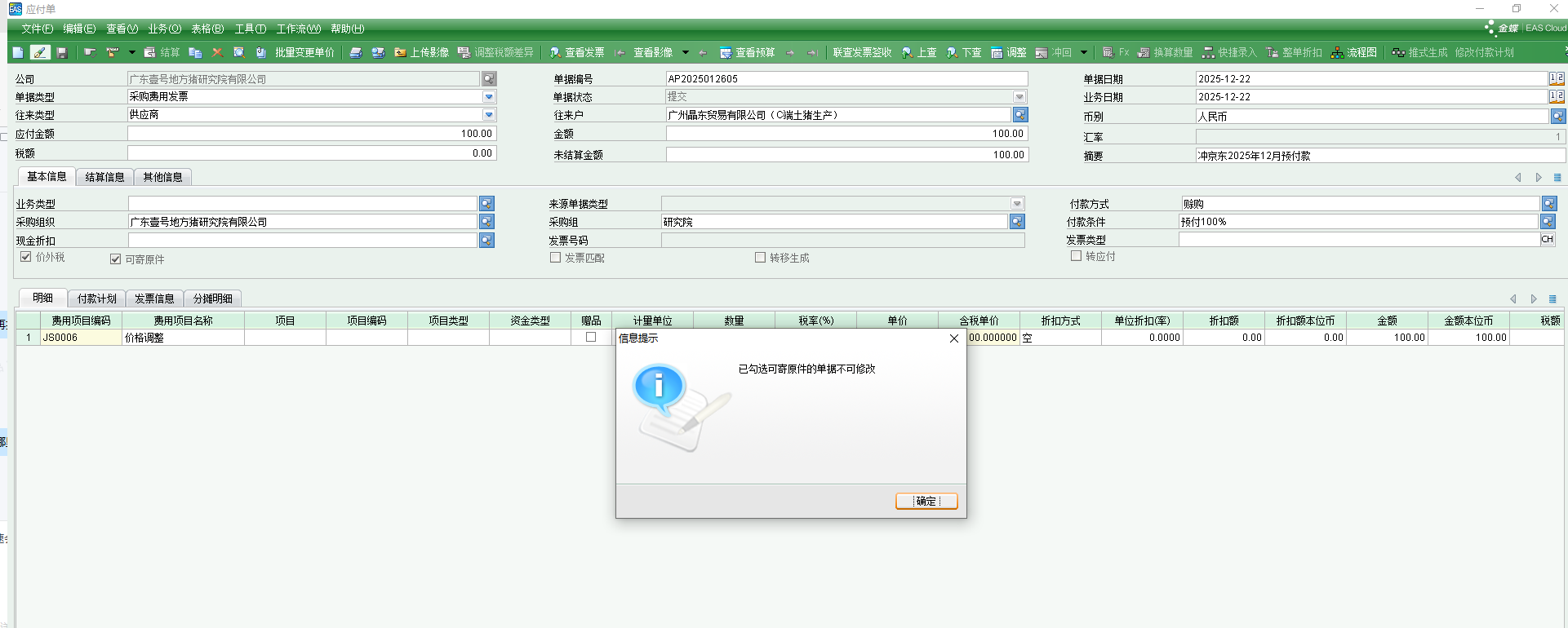 应付单无法修改,提示已寄单的单据不能修改