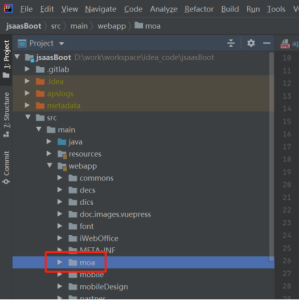 b、index.js中配置编译后输出的路径为后端项目中的moa文件路径,例如本地项目路径为:D:\\work\\workspace\\idea_code\\jsaasBoot,则配置如下: