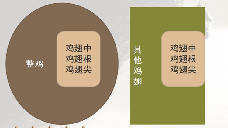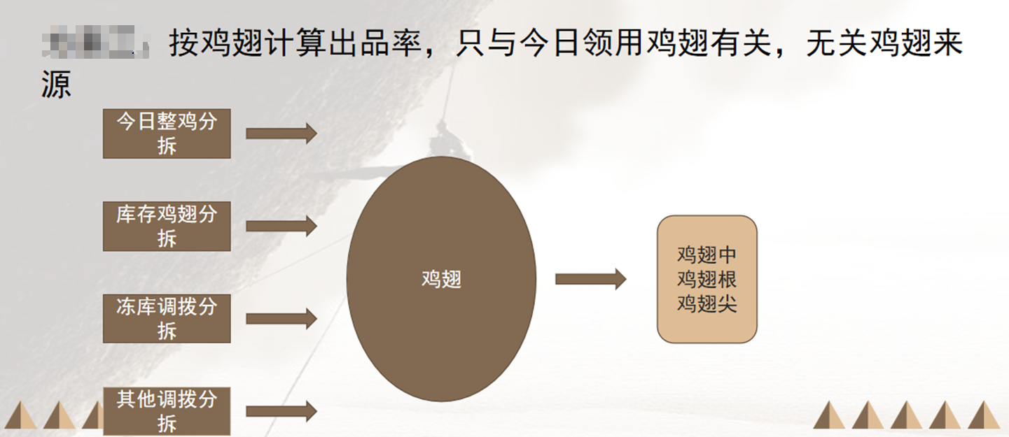 因为广州和深圳加工工艺流程差异,广州先拆成鸡翅,鸡翅再领用分拆成翅根、翅中、翅尖;深圳直接拆分成翅根、翅中、翅尖;又因砍块业务会多出鸡翅,车间也会拆成翅根、翅中、翅尖;