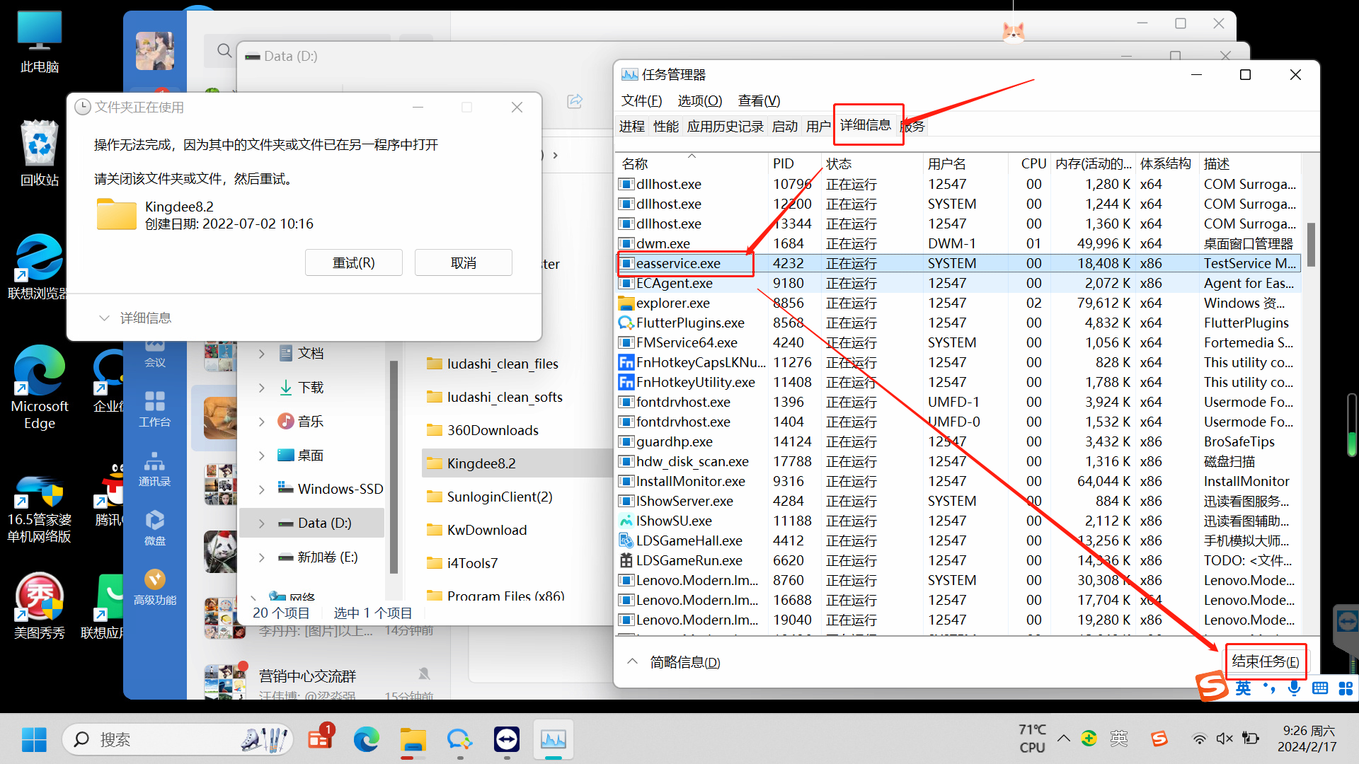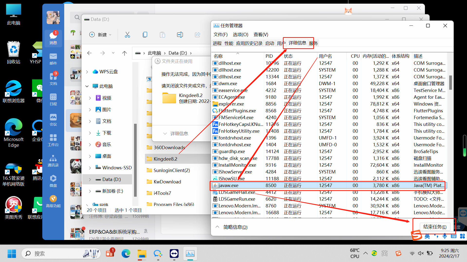 3、切换至【详细信息】,结束【javaw.exe】、【easservice.exe】进程