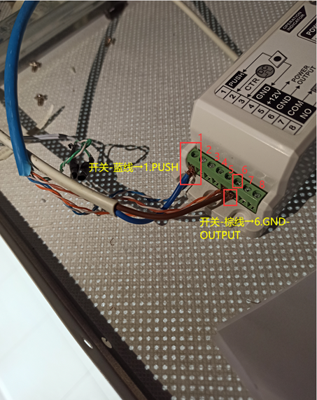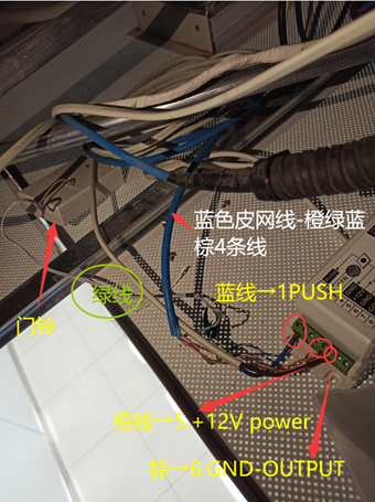 5)将蓝色皮网线橙线接到5.+12Vpower,绿线接到门铃、蓝线接到1.PUSH、棕线接到6.GND-OUTPUT 上。
