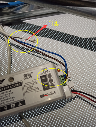 4)将【门头】蓝线接到门禁电源的NC,棕线接到COM