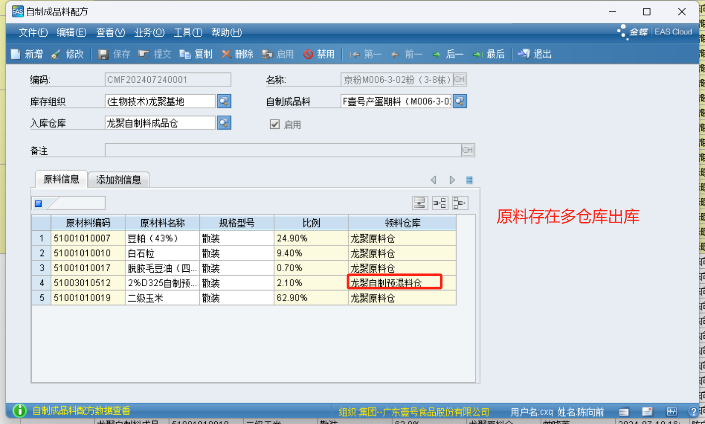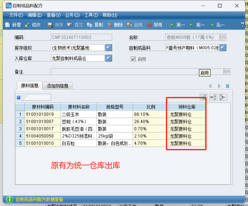 1、背景:过往业务中,自制成品料配方的原料信息,只会有一个仓库出库