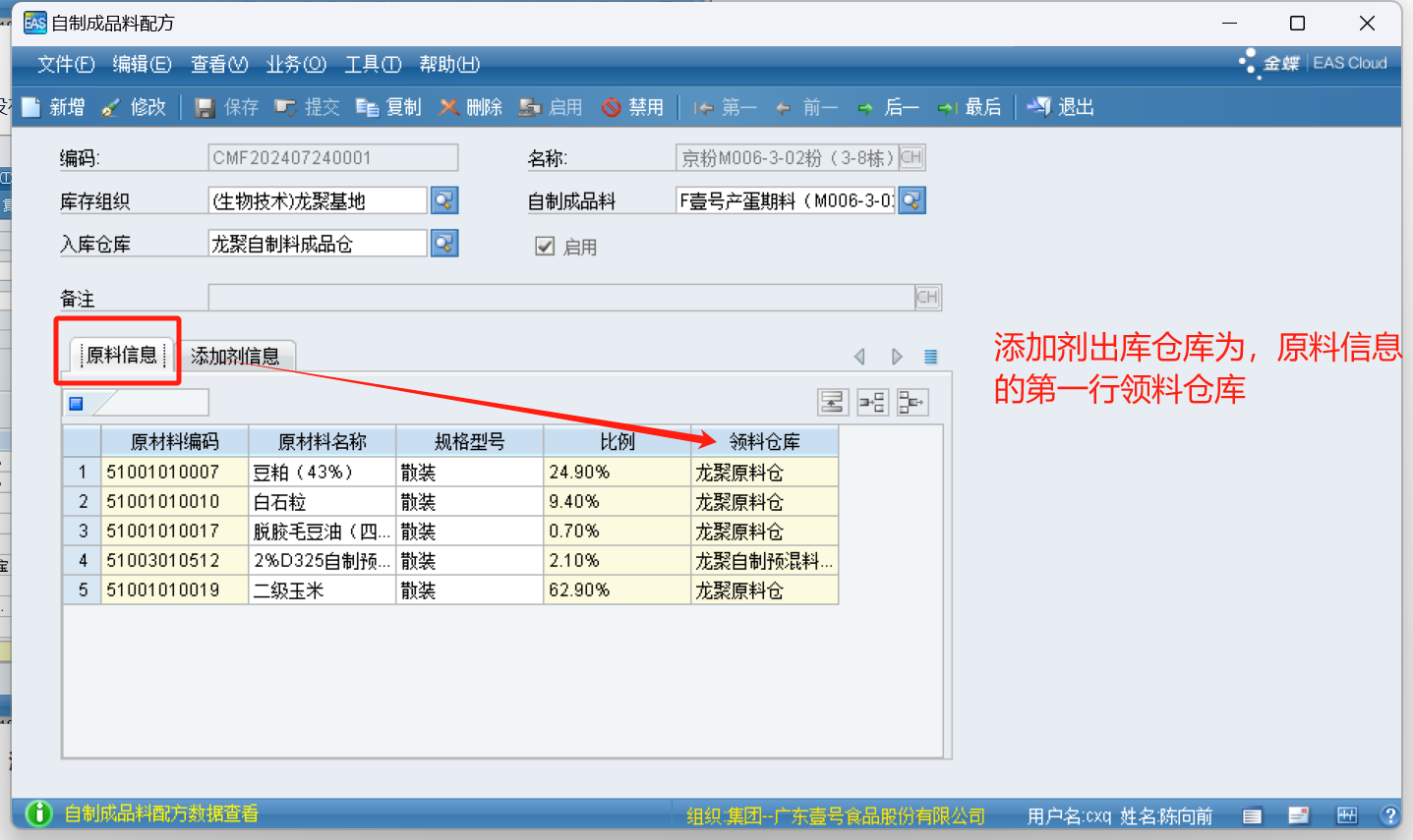3、解决方案:定下业务规则,添加剂信息的出库仓库为原料信息分录的第一行“领料仓库”