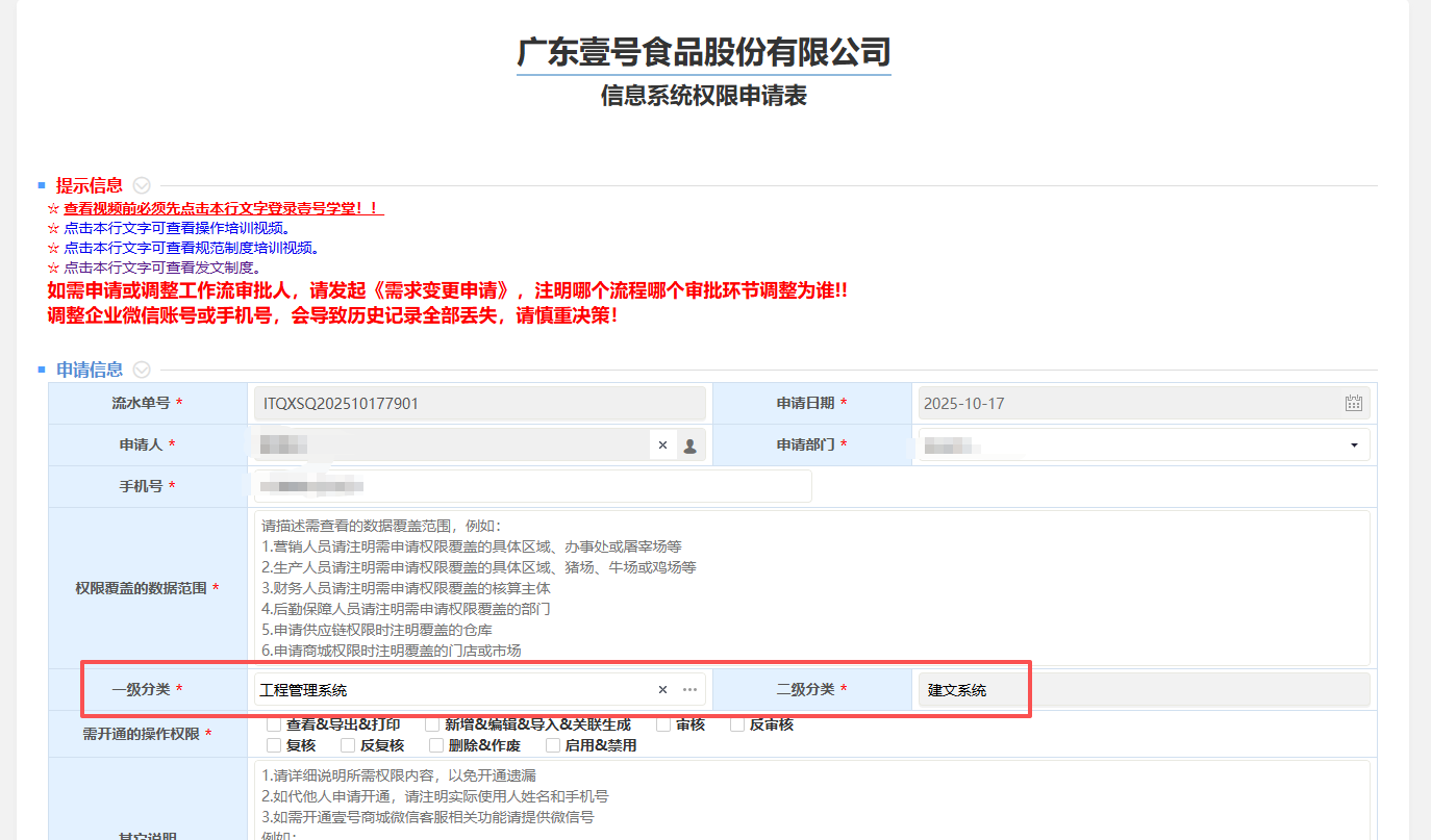 3、在申请单填写界面,一级分类选择【工程管理系统】,二级分类选择【建文系统】,提交后等待审批通过即可