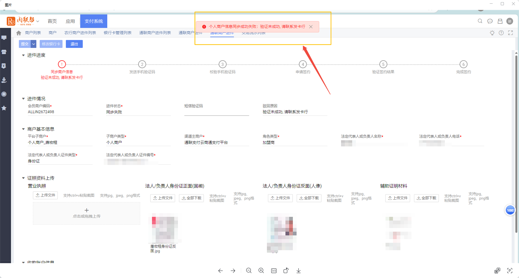 壹号支付-通联进件报错-“ 个人商户信息同步成功失败:验证未成功,请联系发卡行”