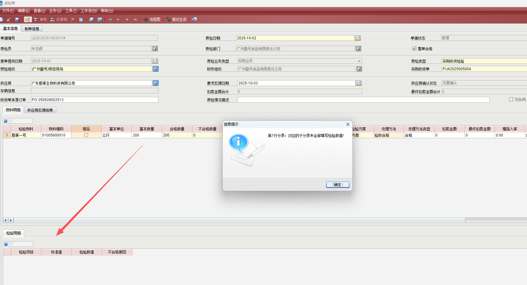 EAS-质检单-质检单无法提交,提示检验数值未填写