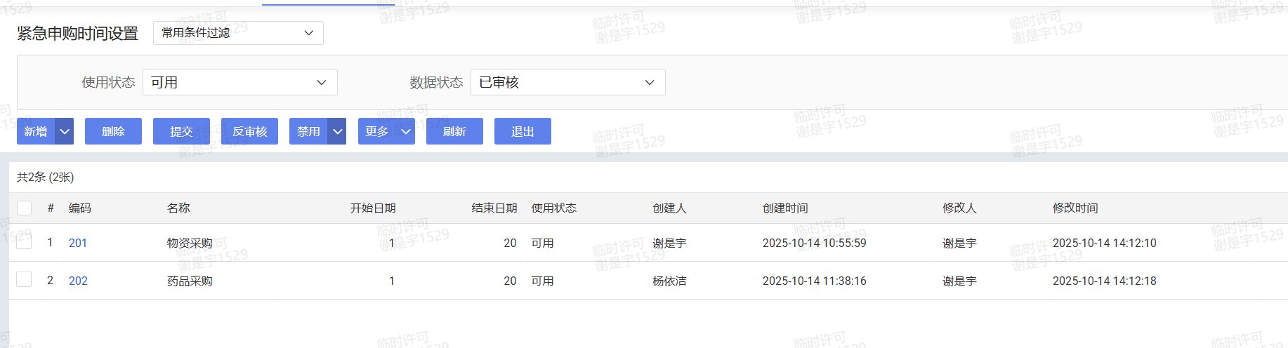需求申请单:系统设置时间区间设置,采购自行设置自动勾选紧急申购的时间范围;业务部门提单时默认勾选紧急,制单人新增需求申请单时系统弹窗强提醒(该时间段为非常规申购时段,是否确认为紧急需求申请单?)选择是,创建时自动为紧急需求,选择否,只能创建暂存,不能提交,到了规定的时间段才能提交;