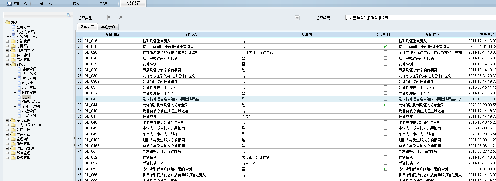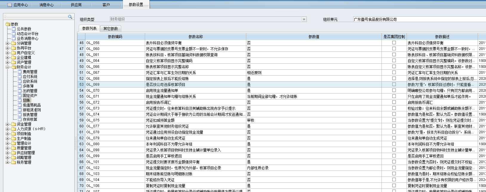 2、搜索框输入参数设置,选择财务会计-总账,将以下参数勾选为是,包括参数GL_043录入核算项目启用组织范围权限隔离和GL_069是否按公司选择核算项目。